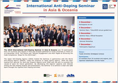 The Japan Anti-Doping Agency (JADA) hosted the annual International Anti-Doping Seminar in Asia and Oceania between 4 and 6 December 2018. A total of 52 participants from 34 countries and regions gathered from around the world, primarily from the Asia-Oceania region, in Japan. To help the participants feel closer to the Tokyo 2020 legacy project, the seminar was held at the Sendagaya Campus of Tsuda University ? a member of the SPORT FOR TOMORROW Consortium. It is the university located closest to the New National Stadium of Japan.
